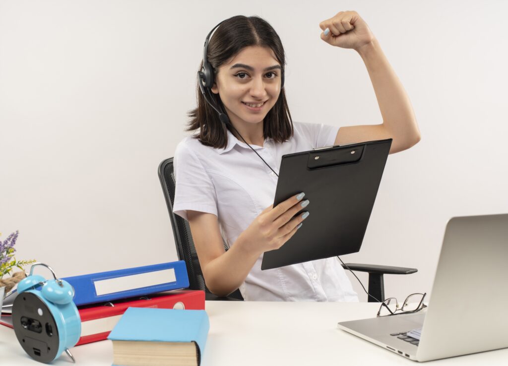 young girl in white shirt and headphones with a microphone holding clipboard clenching fist happy and positive sitting at the table with folders and laptop over white background